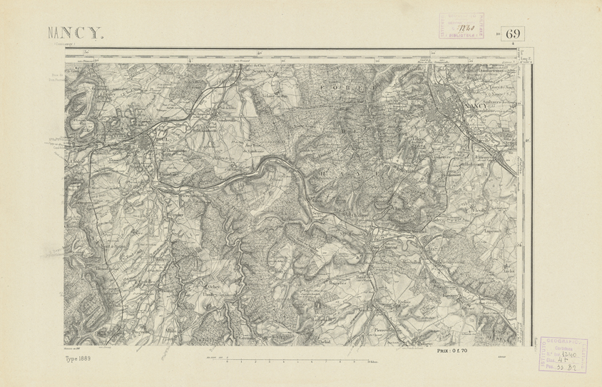 "Paris. Service Géographique de l'Armée, 1889. Ebbe origine dall'Edizione zincografica in quarti di foglio, stabilita dal 1879, per la carta detta de "L'Etat-Major". Infatti non rispondono più il sistema della riproduzione zincografica alle esigenze che la revisione dei fogli imponeva, per un inevitabile logoramento dei rami originali, fu proposta dapprima la correzione degli zinchi, ma questo, importando un lavoro lungo e gravoso, si adottò il procedimento galvanico. I rami galvanici ottenuti e corretti secondo questo sistema presero il nome di "édition type 1889". Allo scopo di facilitare l'incisione fu adoperata la suddivisione in quarti di foglio come per l'edizione zincografica. La revisione dei fogli di questo tipo non fu iniziata che nel 1893. Dal catalogo del S.G.A. risultano mancanti a questa edizione i dipartimenti della "Moselle", del "Bas-Rhin" e del "Haut-Rhin" per i quali non esiste che una edizione in fogli interi aggiornata nel 1901."