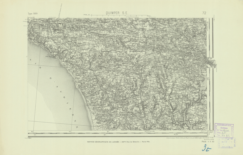 "Paris. Service Géographique de l'Armée, 1889. Ebbe origine dall'Edizione zincografica in quarti di foglio, stabilita dal 1879, per la carta detta de "L'Etat-Major". Infatti non rispondono più il sistema della riproduzione zincografica alle esigenze che la revisione dei fogli imponeva, per un inevitabile logoramento dei rami originali, fu proposta dapprima la correzione degli zinchi, ma questo, importando un lavoro lungo e gravoso, si adottò il procedimento galvanico. I rami galvanici ottenuti e corretti secondo questo sistema presero il nome di "édition type 1889". Allo scopo di facilitare l'incisione fu adoperata la suddivisione in quarti di foglio come per l'edizione zincografica. La revisione dei fogli di questo tipo non fu iniziata che nel 1893. Dal catalogo del S.G.A. risultano mancanti a questa edizione i dipartimenti della "Moselle", del "Bas-Rhin" e del "Haut-Rhin" per i quali non esiste che una edizione in fogli interi aggiornata nel 1901."