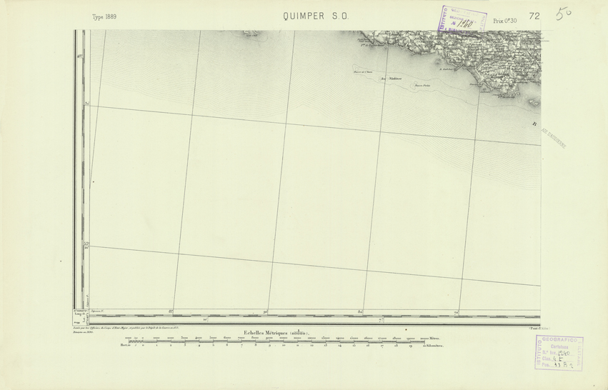 "Paris. Service Géographique de l'Armée, 1889. Ebbe origine dall'Edizione zincografica in quarti di foglio, stabilita dal 1879, per la carta detta de "L'Etat-Major". Infatti non rispondono più il sistema della riproduzione zincografica alle esigenze che la revisione dei fogli imponeva, per un inevitabile logoramento dei rami originali, fu proposta dapprima la correzione degli zinchi, ma questo, importando un lavoro lungo e gravoso, si adottò il procedimento galvanico. I rami galvanici ottenuti e corretti secondo questo sistema presero il nome di "édition type 1889". Allo scopo di facilitare l'incisione fu adoperata la suddivisione in quarti di foglio come per l'edizione zincografica. La revisione dei fogli di questo tipo non fu iniziata che nel 1893. Dal catalogo del S.G.A. risultano mancanti a questa edizione i dipartimenti della "Moselle", del "Bas-Rhin" e del "Haut-Rhin" per i quali non esiste che una edizione in fogli interi aggiornata nel 1901."