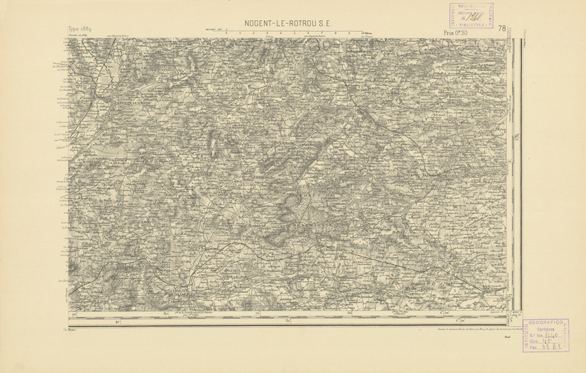 "Paris. Service Géographique de l'Armée, 1889. Ebbe origine dall'Edizione zincografica in quarti di foglio, stabilita dal 1879, per la carta detta de "L'Etat-Major". Infatti non rispondono più il sistema della riproduzione zincografica alle esigenze che la revisione dei fogli imponeva, per un inevitabile logoramento dei rami originali, fu proposta dapprima la correzione degli zinchi, ma questo, importando un lavoro lungo e gravoso, si adottò il procedimento galvanico. I rami galvanici ottenuti e corretti secondo questo sistema presero il nome di "édition type 1889". Allo scopo di facilitare l'incisione fu adoperata la suddivisione in quarti di foglio come per l'edizione zincografica. La revisione dei fogli di questo tipo non fu iniziata che nel 1893. Dal catalogo del S.G.A. risultano mancanti a questa edizione i dipartimenti della "Moselle", del "Bas-Rhin" e del "Haut-Rhin" per i quali non esiste che una edizione in fogli interi aggiornata nel 1901."