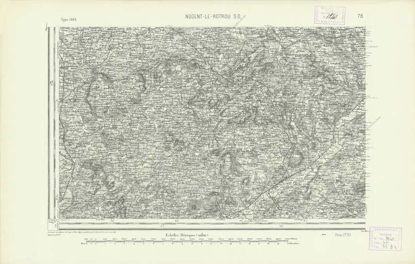 "Paris. Service Géographique de l'Armée, 1889. Ebbe origine dall'Edizione zincografica in quarti di foglio, stabilita dal 1879, per la carta detta de "L'Etat-Major". Infatti non rispondono più il sistema della riproduzione zincografica alle esigenze che la revisione dei fogli imponeva, per un inevitabile logoramento dei rami originali, fu proposta dapprima la correzione degli zinchi, ma questo, importando un lavoro lungo e gravoso, si adottò il procedimento galvanico. I rami galvanici ottenuti e corretti secondo questo sistema presero il nome di "édition type 1889". Allo scopo di facilitare l'incisione fu adoperata la suddivisione in quarti di foglio come per l'edizione zincografica. La revisione dei fogli di questo tipo non fu iniziata che nel 1893. Dal catalogo del S.G.A. risultano mancanti a questa edizione i dipartimenti della "Moselle", del "Bas-Rhin" e del "Haut-Rhin" per i quali non esiste che una edizione in fogli interi aggiornata nel 1901."