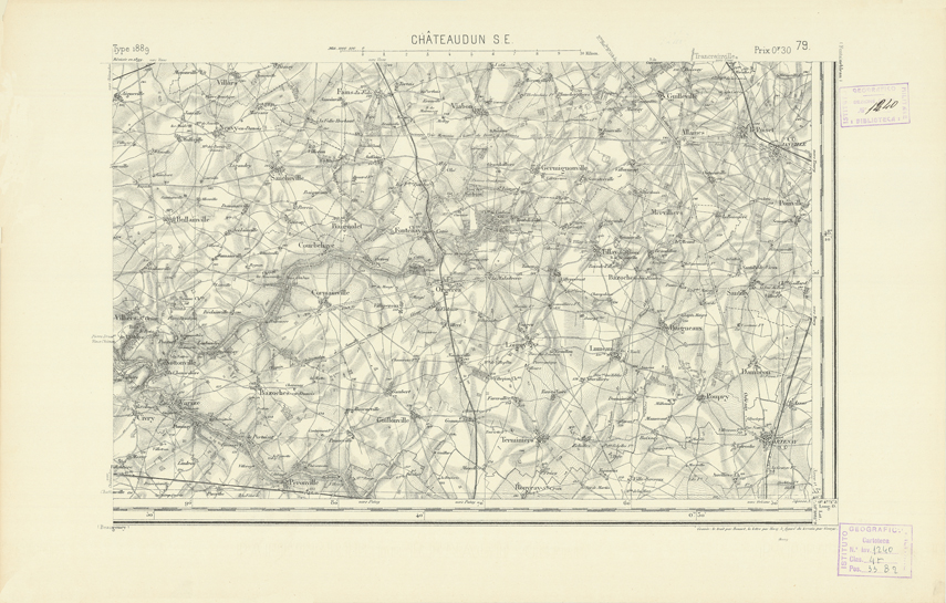 "Paris. Service Géographique de l'Armée, 1889. Ebbe origine dall'Edizione zincografica in quarti di foglio, stabilita dal 1879, per la carta detta de "L'Etat-Major". Infatti non rispondono più il sistema della riproduzione zincografica alle esigenze che la revisione dei fogli imponeva, per un inevitabile logoramento dei rami originali, fu proposta dapprima la correzione degli zinchi, ma questo, importando un lavoro lungo e gravoso, si adottò il procedimento galvanico. I rami galvanici ottenuti e corretti secondo questo sistema presero il nome di "édition type 1889". Allo scopo di facilitare l'incisione fu adoperata la suddivisione in quarti di foglio come per l'edizione zincografica. La revisione dei fogli di questo tipo non fu iniziata che nel 1893. Dal catalogo del S.G.A. risultano mancanti a questa edizione i dipartimenti della "Moselle", del "Bas-Rhin" e del "Haut-Rhin" per i quali non esiste che una edizione in fogli interi aggiornata nel 1901."