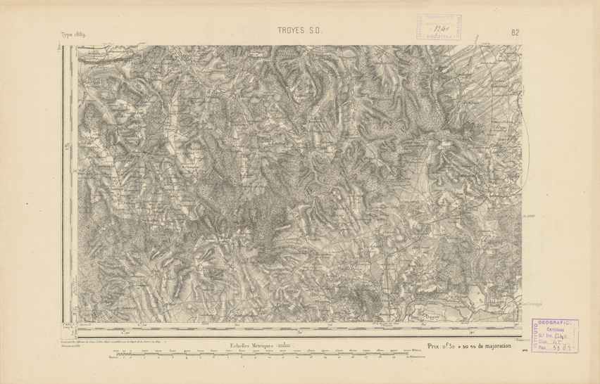 "Paris. Service Géographique de l'Armée, 1889. Ebbe origine dall'Edizione zincografica in quarti di foglio, stabilita dal 1879, per la carta detta de "L'Etat-Major". Infatti non rispondono più il sistema della riproduzione zincografica alle esigenze che la revisione dei fogli imponeva, per un inevitabile logoramento dei rami originali, fu proposta dapprima la correzione degli zinchi, ma questo, importando un lavoro lungo e gravoso, si adottò il procedimento galvanico. I rami galvanici ottenuti e corretti secondo questo sistema presero il nome di "édition type 1889". Allo scopo di facilitare l'incisione fu adoperata la suddivisione in quarti di foglio come per l'edizione zincografica. La revisione dei fogli di questo tipo non fu iniziata che nel 1893. Dal catalogo del S.G.A. risultano mancanti a questa edizione i dipartimenti della "Moselle", del "Bas-Rhin" e del "Haut-Rhin" per i quali non esiste che una edizione in fogli interi aggiornata nel 1901."