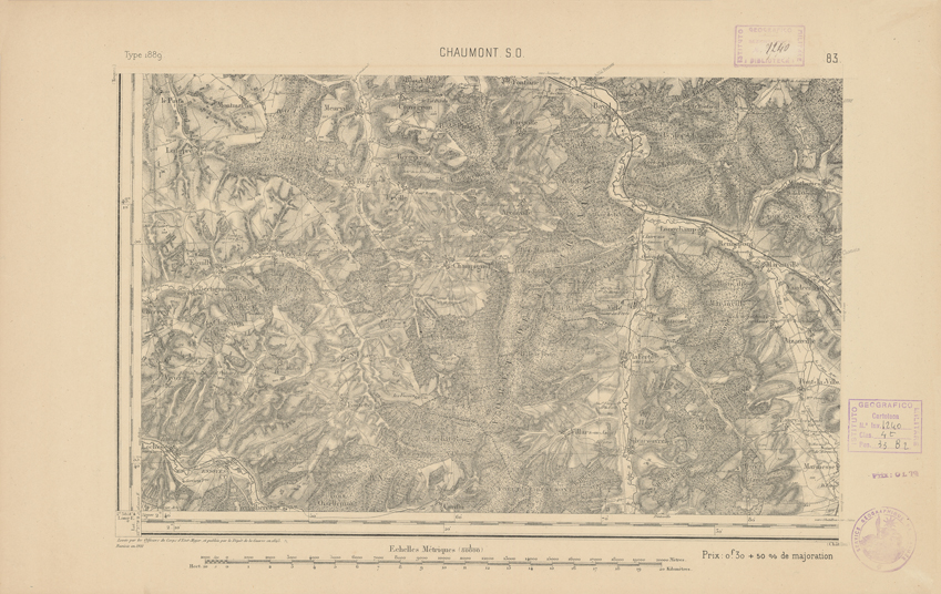 "Paris. Service Géographique de l'Armée, 1889. Ebbe origine dall'Edizione zincografica in quarti di foglio, stabilita dal 1879, per la carta detta de "L'Etat-Major". Infatti non rispondono più il sistema della riproduzione zincografica alle esigenze che la revisione dei fogli imponeva, per un inevitabile logoramento dei rami originali, fu proposta dapprima la correzione degli zinchi, ma questo, importando un lavoro lungo e gravoso, si adottò il procedimento galvanico. I rami galvanici ottenuti e corretti secondo questo sistema presero il nome di "édition type 1889". Allo scopo di facilitare l'incisione fu adoperata la suddivisione in quarti di foglio come per l'edizione zincografica. La revisione dei fogli di questo tipo non fu iniziata che nel 1893. Dal catalogo del S.G.A. risultano mancanti a questa edizione i dipartimenti della "Moselle", del "Bas-Rhin" e del "Haut-Rhin" per i quali non esiste che una edizione in fogli interi aggiornata nel 1901."