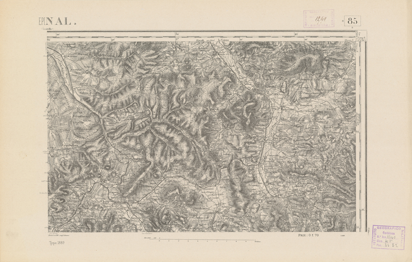 "Paris. Service Géographique de l'Armée, 1889. Ebbe origine dall'Edizione zincografica in quarti di foglio, stabilita dal 1879, per la carta detta de "L'Etat-Major". Infatti non rispondono più il sistema della riproduzione zincografica alle esigenze che la revisione dei fogli imponeva, per un inevitabile logoramento dei rami originali, fu proposta dapprima la correzione degli zinchi, ma questo, importando un lavoro lungo e gravoso, si adottò il procedimento galvanico. I rami galvanici ottenuti e corretti secondo questo sistema presero il nome di "édition type 1889". Allo scopo di facilitare l'incisione fu adoperata la suddivisione in quarti di foglio come per l'edizione zincografica. La revisione dei fogli di questo tipo non fu iniziata che nel 1893. Dal catalogo del S.G.A. risultano mancanti a questa edizione i dipartimenti della "Moselle", del "Bas-Rhin" e del "Haut-Rhin" per i quali non esiste che una edizione in fogli interi aggiornata nel 1901."