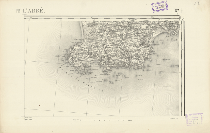 "Paris. Service Géographique de l'Armée, 1889. Ebbe origine dall'Edizione zincografica in quarti di foglio, stabilita dal 1879, per la carta detta de "L'Etat-Major". Infatti non rispondono più il sistema della riproduzione zincografica alle esigenze che la revisione dei fogli imponeva, per un inevitabile logoramento dei rami originali, fu proposta dapprima la correzione degli zinchi, ma questo, importando un lavoro lungo e gravoso, si adottò il procedimento galvanico. I rami galvanici ottenuti e corretti secondo questo sistema presero il nome di "édition type 1889". Allo scopo di facilitare l'incisione fu adoperata la suddivisione in quarti di foglio come per l'edizione zincografica. La revisione dei fogli di questo tipo non fu iniziata che nel 1893. Dal catalogo del S.G.A. risultano mancanti a questa edizione i dipartimenti della "Moselle", del "Bas-Rhin" e del "Haut-Rhin" per i quali non esiste che una edizione in fogli interi aggiornata nel 1901."