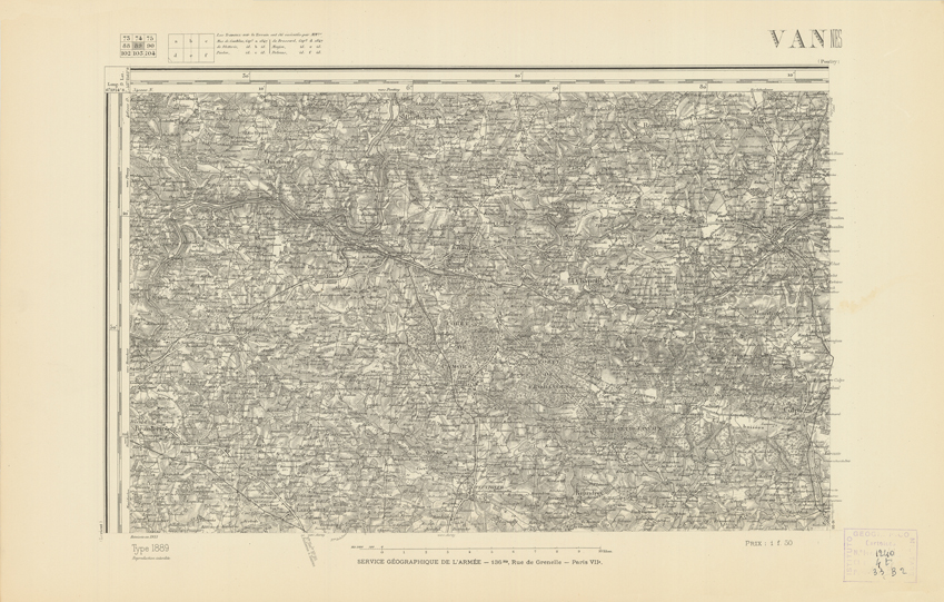 "Paris. Service Géographique de l'Armée, 1889. Ebbe origine dall'Edizione zincografica in quarti di foglio, stabilita dal 1879, per la carta detta de "L'Etat-Major". Infatti non rispondono più il sistema della riproduzione zincografica alle esigenze che la revisione dei fogli imponeva, per un inevitabile logoramento dei rami originali, fu proposta dapprima la correzione degli zinchi, ma questo, importando un lavoro lungo e gravoso, si adottò il procedimento galvanico. I rami galvanici ottenuti e corretti secondo questo sistema presero il nome di "édition type 1889". Allo scopo di facilitare l'incisione fu adoperata la suddivisione in quarti di foglio come per l'edizione zincografica. La revisione dei fogli di questo tipo non fu iniziata che nel 1893. Dal catalogo del S.G.A. risultano mancanti a questa edizione i dipartimenti della "Moselle", del "Bas-Rhin" e del "Haut-Rhin" per i quali non esiste che una edizione in fogli interi aggiornata nel 1901."