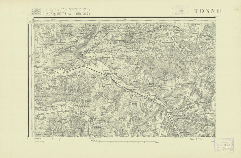 "Paris. Service Géographique de l'Armée, 1889. Ebbe origine dall'Edizione zincografica in quarti di foglio, stabilita dal 1879, per la carta detta de "L'Etat-Major". Infatti non rispondono più il sistema della riproduzione zincografica alle esigenze che la revisione dei fogli imponeva, per un inevitabile logoramento dei rami originali, fu proposta dapprima la correzione degli zinchi, ma questo, importando un lavoro lungo e gravoso, si adottò il procedimento galvanico. I rami galvanici ottenuti e corretti secondo questo sistema presero il nome di "édition type 1889". Allo scopo di facilitare l'incisione fu adoperata la suddivisione in quarti di foglio come per l'edizione zincografica. La revisione dei fogli di questo tipo non fu iniziata che nel 1893. Dal catalogo del S.G.A. risultano mancanti a questa edizione i dipartimenti della "Moselle", del "Bas-Rhin" e del "Haut-Rhin" per i quali non esiste che una edizione in fogli interi aggiornata nel 1901."