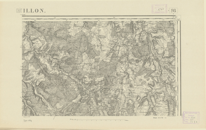"Paris. Service Géographique de l'Armée, 1889. Ebbe origine dall'Edizione zincografica in quarti di foglio, stabilita dal 1879, per la carta detta de "L'Etat-Major". Infatti non rispondono più il sistema della riproduzione zincografica alle esigenze che la revisione dei fogli imponeva, per un inevitabile logoramento dei rami originali, fu proposta dapprima la correzione degli zinchi, ma questo, importando un lavoro lungo e gravoso, si adottò il procedimento galvanico. I rami galvanici ottenuti e corretti secondo questo sistema presero il nome di "édition type 1889". Allo scopo di facilitare l'incisione fu adoperata la suddivisione in quarti di foglio come per l'edizione zincografica. La revisione dei fogli di questo tipo non fu iniziata che nel 1893. Dal catalogo del S.G.A. risultano mancanti a questa edizione i dipartimenti della "Moselle", del "Bas-Rhin" e del "Haut-Rhin" per i quali non esiste che una edizione in fogli interi aggiornata nel 1901."