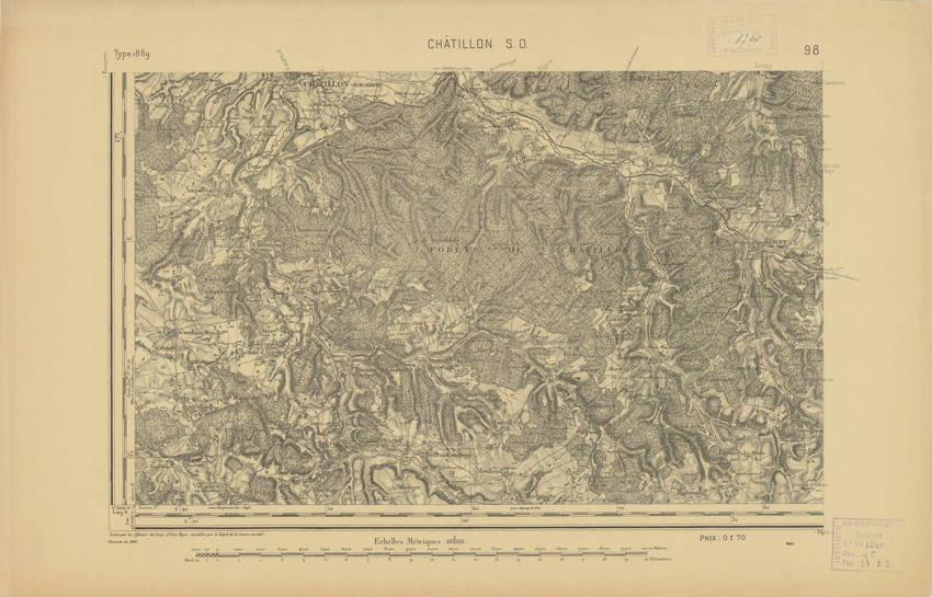 "Paris. Service Géographique de l'Armée, 1889. Ebbe origine dall'Edizione zincografica in quarti di foglio, stabilita dal 1879, per la carta detta de "L'Etat-Major". Infatti non rispondono più il sistema della riproduzione zincografica alle esigenze che la revisione dei fogli imponeva, per un inevitabile logoramento dei rami originali, fu proposta dapprima la correzione degli zinchi, ma questo, importando un lavoro lungo e gravoso, si adottò il procedimento galvanico. I rami galvanici ottenuti e corretti secondo questo sistema presero il nome di "édition type 1889". Allo scopo di facilitare l'incisione fu adoperata la suddivisione in quarti di foglio come per l'edizione zincografica. La revisione dei fogli di questo tipo non fu iniziata che nel 1893. Dal catalogo del S.G.A. risultano mancanti a questa edizione i dipartimenti della "Moselle", del "Bas-Rhin" e del "Haut-Rhin" per i quali non esiste che una edizione in fogli interi aggiornata nel 1901."