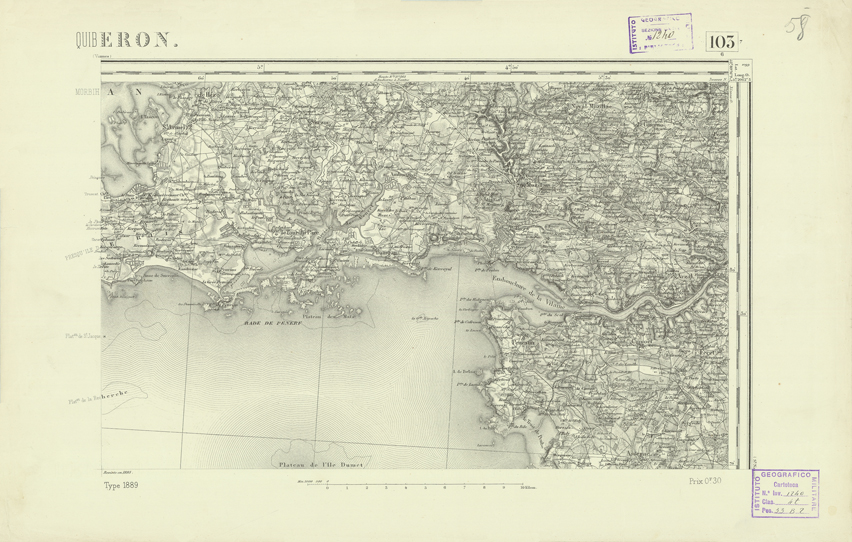 "Paris. Service Géographique de l'Armée, 1889. Ebbe origine dall'Edizione zincografica in quarti di foglio, stabilita dal 1879, per la carta detta de "L'Etat-Major". Infatti non rispondono più il sistema della riproduzione zincografica alle esigenze che la revisione dei fogli imponeva, per un inevitabile logoramento dei rami originali, fu proposta dapprima la correzione degli zinchi, ma questo, importando un lavoro lungo e gravoso, si adottò il procedimento galvanico. I rami galvanici ottenuti e corretti secondo questo sistema presero il nome di "édition type 1889". Allo scopo di facilitare l'incisione fu adoperata la suddivisione in quarti di foglio come per l'edizione zincografica. La revisione dei fogli di questo tipo non fu iniziata che nel 1893. Dal catalogo del S.G.A. risultano mancanti a questa edizione i dipartimenti della "Moselle", del "Bas-Rhin" e del "Haut-Rhin" per i quali non esiste che una edizione in fogli interi aggiornata nel 1901."