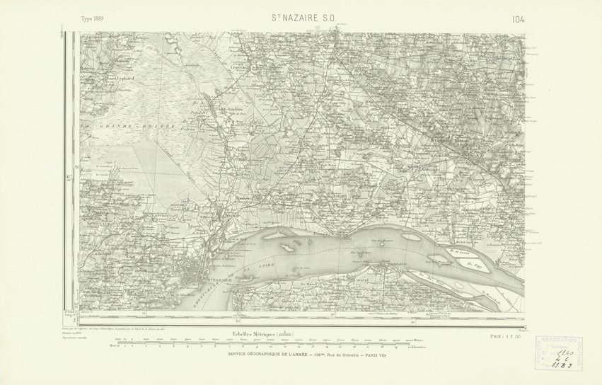 "Paris. Service Géographique de l'Armée, 1889. Ebbe origine dall'Edizione zincografica in quarti di foglio, stabilita dal 1879, per la carta detta de "L'Etat-Major". Infatti non rispondono più il sistema della riproduzione zincografica alle esigenze che la revisione dei fogli imponeva, per un inevitabile logoramento dei rami originali, fu proposta dapprima la correzione degli zinchi, ma questo, importando un lavoro lungo e gravoso, si adottò il procedimento galvanico. I rami galvanici ottenuti e corretti secondo questo sistema presero il nome di "édition type 1889". Allo scopo di facilitare l'incisione fu adoperata la suddivisione in quarti di foglio come per l'edizione zincografica. La revisione dei fogli di questo tipo non fu iniziata che nel 1893. Dal catalogo del S.G.A. risultano mancanti a questa edizione i dipartimenti della "Moselle", del "Bas-Rhin" e del "Haut-Rhin" per i quali non esiste che una edizione in fogli interi aggiornata nel 1901."
