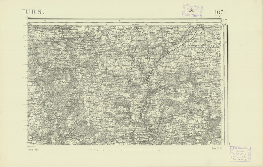 "Paris. Service Géographique de l'Armée, 1889. Ebbe origine dall'Edizione zincografica in quarti di foglio, stabilita dal 1879, per la carta detta de "L'Etat-Major". Infatti non rispondono più il sistema della riproduzione zincografica alle esigenze che la revisione dei fogli imponeva, per un inevitabile logoramento dei rami originali, fu proposta dapprima la correzione degli zinchi, ma questo, importando un lavoro lungo e gravoso, si adottò il procedimento galvanico. I rami galvanici ottenuti e corretti secondo questo sistema presero il nome di "édition type 1889". Allo scopo di facilitare l'incisione fu adoperata la suddivisione in quarti di foglio come per l'edizione zincografica. La revisione dei fogli di questo tipo non fu iniziata che nel 1893. Dal catalogo del S.G.A. risultano mancanti a questa edizione i dipartimenti della "Moselle", del "Bas-Rhin" e del "Haut-Rhin" per i quali non esiste che una edizione in fogli interi aggiornata nel 1901."