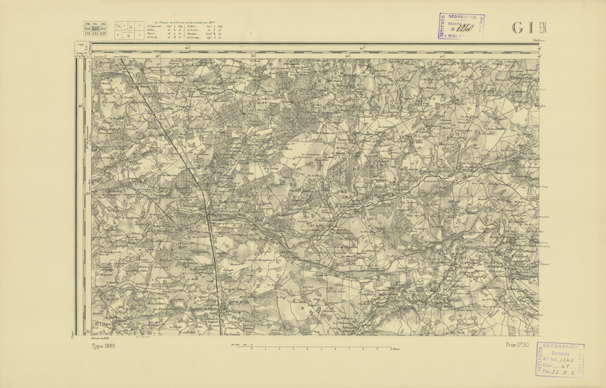 "Paris. Service Géographique de l'Armée, 1889. Ebbe origine dall'Edizione zincografica in quarti di foglio, stabilita dal 1879, per la carta detta de "L'Etat-Major". Infatti non rispondono più il sistema della riproduzione zincografica alle esigenze che la revisione dei fogli imponeva, per un inevitabile logoramento dei rami originali, fu proposta dapprima la correzione degli zinchi, ma questo, importando un lavoro lungo e gravoso, si adottò il procedimento galvanico. I rami galvanici ottenuti e corretti secondo questo sistema presero il nome di "édition type 1889". Allo scopo di facilitare l'incisione fu adoperata la suddivisione in quarti di foglio come per l'edizione zincografica. La revisione dei fogli di questo tipo non fu iniziata che nel 1893. Dal catalogo del S.G.A. risultano mancanti a questa edizione i dipartimenti della "Moselle", del "Bas-Rhin" e del "Haut-Rhin" per i quali non esiste che una edizione in fogli interi aggiornata nel 1901."