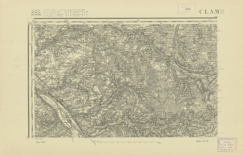 "Paris. Service Géographique de l'Armée, 1889. Ebbe origine dall'Edizione zincografica in quarti di foglio, stabilita dal 1879, per la carta detta de "L'Etat-Major". Infatti non rispondono più il sistema della riproduzione zincografica alle esigenze che la revisione dei fogli imponeva, per un inevitabile logoramento dei rami originali, fu proposta dapprima la correzione degli zinchi, ma questo, importando un lavoro lungo e gravoso, si adottò il procedimento galvanico. I rami galvanici ottenuti e corretti secondo questo sistema presero il nome di "édition type 1889". Allo scopo di facilitare l'incisione fu adoperata la suddivisione in quarti di foglio come per l'edizione zincografica. La revisione dei fogli di questo tipo non fu iniziata che nel 1893. Dal catalogo del S.G.A. risultano mancanti a questa edizione i dipartimenti della "Moselle", del "Bas-Rhin" e del "Haut-Rhin" per i quali non esiste che una edizione in fogli interi aggiornata nel 1901."