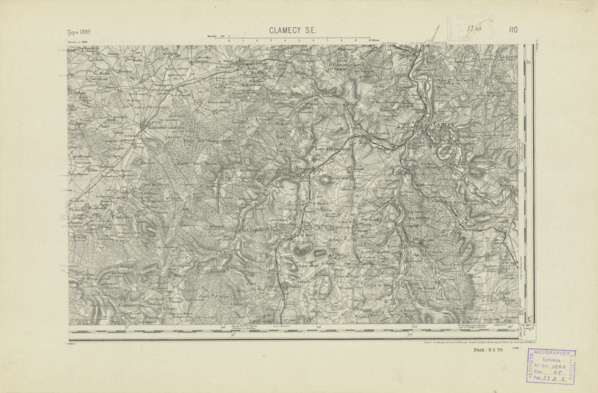 "Paris. Service Géographique de l'Armée, 1889. Ebbe origine dall'Edizione zincografica in quarti di foglio, stabilita dal 1879, per la carta detta de "L'Etat-Major". Infatti non rispondono più il sistema della riproduzione zincografica alle esigenze che la revisione dei fogli imponeva, per un inevitabile logoramento dei rami originali, fu proposta dapprima la correzione degli zinchi, ma questo, importando un lavoro lungo e gravoso, si adottò il procedimento galvanico. I rami galvanici ottenuti e corretti secondo questo sistema presero il nome di "édition type 1889". Allo scopo di facilitare l'incisione fu adoperata la suddivisione in quarti di foglio come per l'edizione zincografica. La revisione dei fogli di questo tipo non fu iniziata che nel 1893. Dal catalogo del S.G.A. risultano mancanti a questa edizione i dipartimenti della "Moselle", del "Bas-Rhin" e del "Haut-Rhin" per i quali non esiste che una edizione in fogli interi aggiornata nel 1901."