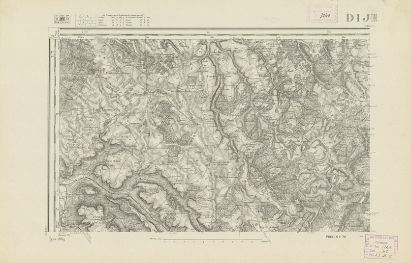 "Paris. Service Géographique de l'Armée, 1889. Ebbe origine dall'Edizione zincografica in quarti di foglio, stabilita dal 1879, per la carta detta de "L'Etat-Major". Infatti non rispondono più il sistema della riproduzione zincografica alle esigenze che la revisione dei fogli imponeva, per un inevitabile logoramento dei rami originali, fu proposta dapprima la correzione degli zinchi, ma questo, importando un lavoro lungo e gravoso, si adottò il procedimento galvanico. I rami galvanici ottenuti e corretti secondo questo sistema presero il nome di "édition type 1889". Allo scopo di facilitare l'incisione fu adoperata la suddivisione in quarti di foglio come per l'edizione zincografica. La revisione dei fogli di questo tipo non fu iniziata che nel 1893. Dal catalogo del S.G.A. risultano mancanti a questa edizione i dipartimenti della "Moselle", del "Bas-Rhin" e del "Haut-Rhin" per i quali non esiste che una edizione in fogli interi aggiornata nel 1901."