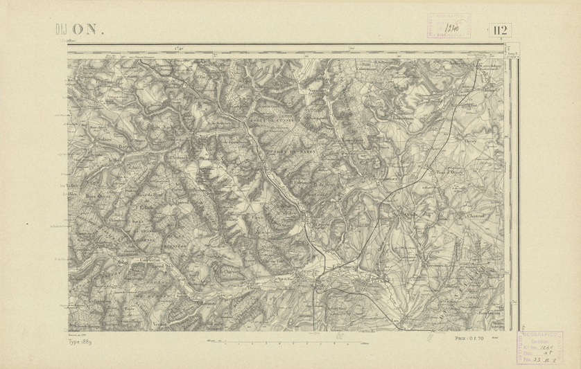 "Paris. Service Géographique de l'Armée, 1889. Ebbe origine dall'Edizione zincografica in quarti di foglio, stabilita dal 1879, per la carta detta de "L'Etat-Major". Infatti non rispondono più il sistema della riproduzione zincografica alle esigenze che la revisione dei fogli imponeva, per un inevitabile logoramento dei rami originali, fu proposta dapprima la correzione degli zinchi, ma questo, importando un lavoro lungo e gravoso, si adottò il procedimento galvanico. I rami galvanici ottenuti e corretti secondo questo sistema presero il nome di "édition type 1889". Allo scopo di facilitare l'incisione fu adoperata la suddivisione in quarti di foglio come per l'edizione zincografica. La revisione dei fogli di questo tipo non fu iniziata che nel 1893. Dal catalogo del S.G.A. risultano mancanti a questa edizione i dipartimenti della "Moselle", del "Bas-Rhin" e del "Haut-Rhin" per i quali non esiste che una edizione in fogli interi aggiornata nel 1901."