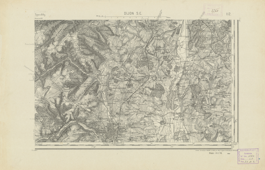 "Paris. Service Géographique de l'Armée, 1889. Ebbe origine dall'Edizione zincografica in quarti di foglio, stabilita dal 1879, per la carta detta de "L'Etat-Major". Infatti non rispondono più il sistema della riproduzione zincografica alle esigenze che la revisione dei fogli imponeva, per un inevitabile logoramento dei rami originali, fu proposta dapprima la correzione degli zinchi, ma questo, importando un lavoro lungo e gravoso, si adottò il procedimento galvanico. I rami galvanici ottenuti e corretti secondo questo sistema presero il nome di "édition type 1889". Allo scopo di facilitare l'incisione fu adoperata la suddivisione in quarti di foglio come per l'edizione zincografica. La revisione dei fogli di questo tipo non fu iniziata che nel 1893. Dal catalogo del S.G.A. risultano mancanti a questa edizione i dipartimenti della "Moselle", del "Bas-Rhin" e del "Haut-Rhin" per i quali non esiste che una edizione in fogli interi aggiornata nel 1901."
