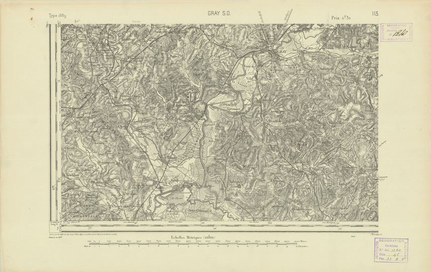 "Paris. Service Géographique de l'Armée, 1889. Ebbe origine dall'Edizione zincografica in quarti di foglio, stabilita dal 1879, per la carta detta de "L'Etat-Major". Infatti non rispondono più il sistema della riproduzione zincografica alle esigenze che la revisione dei fogli imponeva, per un inevitabile logoramento dei rami originali, fu proposta dapprima la correzione degli zinchi, ma questo, importando un lavoro lungo e gravoso, si adottò il procedimento galvanico. I rami galvanici ottenuti e corretti secondo questo sistema presero il nome di "édition type 1889". Allo scopo di facilitare l'incisione fu adoperata la suddivisione in quarti di foglio come per l'edizione zincografica. La revisione dei fogli di questo tipo non fu iniziata che nel 1893. Dal catalogo del S.G.A. risultano mancanti a questa edizione i dipartimenti della "Moselle", del "Bas-Rhin" e del "Haut-Rhin" per i quali non esiste che una edizione in fogli interi aggiornata nel 1901."