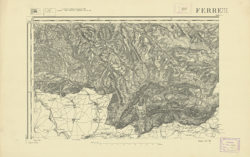 "Paris. Service Géographique de l'Armée, 1889. Ebbe origine dall'Edizione zincografica in quarti di foglio, stabilita dal 1879, per la carta detta de "L'Etat-Major". Infatti non rispondono più il sistema della riproduzione zincografica alle esigenze che la revisione dei fogli imponeva, per un inevitabile logoramento dei rami originali, fu proposta dapprima la correzione degli zinchi, ma questo, importando un lavoro lungo e gravoso, si adottò il procedimento galvanico. I rami galvanici ottenuti e corretti secondo questo sistema presero il nome di "édition type 1889". Allo scopo di facilitare l'incisione fu adoperata la suddivisione in quarti di foglio come per l'edizione zincografica. La revisione dei fogli di questo tipo non fu iniziata che nel 1893. Dal catalogo del S.G.A. risultano mancanti a questa edizione i dipartimenti della "Moselle", del "Bas-Rhin" e del "Haut-Rhin" per i quali non esiste che una edizione in fogli interi aggiornata nel 1901."