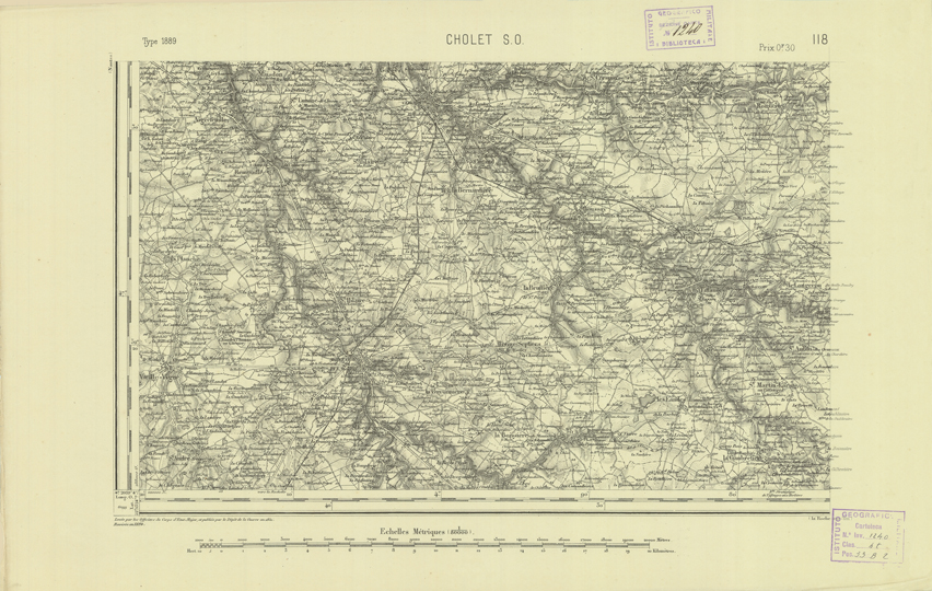 "Paris. Service Géographique de l'Armée, 1889. Ebbe origine dall'Edizione zincografica in quarti di foglio, stabilita dal 1879, per la carta detta de "L'Etat-Major". Infatti non rispondono più il sistema della riproduzione zincografica alle esigenze che la revisione dei fogli imponeva, per un inevitabile logoramento dei rami originali, fu proposta dapprima la correzione degli zinchi, ma questo, importando un lavoro lungo e gravoso, si adottò il procedimento galvanico. I rami galvanici ottenuti e corretti secondo questo sistema presero il nome di "édition type 1889". Allo scopo di facilitare l'incisione fu adoperata la suddivisione in quarti di foglio come per l'edizione zincografica. La revisione dei fogli di questo tipo non fu iniziata che nel 1893. Dal catalogo del S.G.A. risultano mancanti a questa edizione i dipartimenti della "Moselle", del "Bas-Rhin" e del "Haut-Rhin" per i quali non esiste che una edizione in fogli interi aggiornata nel 1901."