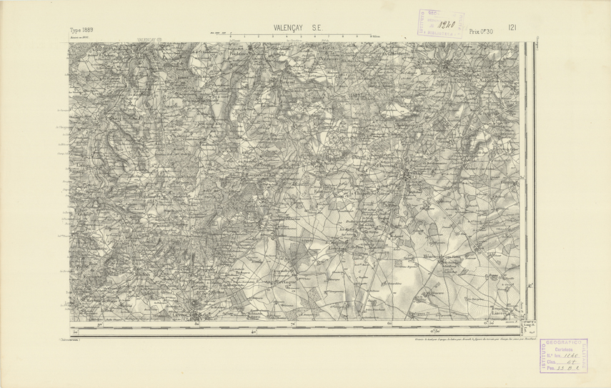 "Paris. Service Géographique de l'Armée, 1889. Ebbe origine dall'Edizione zincografica in quarti di foglio, stabilita dal 1879, per la carta detta de "L'Etat-Major". Infatti non rispondono più il sistema della riproduzione zincografica alle esigenze che la revisione dei fogli imponeva, per un inevitabile logoramento dei rami originali, fu proposta dapprima la correzione degli zinchi, ma questo, importando un lavoro lungo e gravoso, si adottò il procedimento galvanico. I rami galvanici ottenuti e corretti secondo questo sistema presero il nome di "édition type 1889". Allo scopo di facilitare l'incisione fu adoperata la suddivisione in quarti di foglio come per l'edizione zincografica. La revisione dei fogli di questo tipo non fu iniziata che nel 1893. Dal catalogo del S.G.A. risultano mancanti a questa edizione i dipartimenti della "Moselle", del "Bas-Rhin" e del "Haut-Rhin" per i quali non esiste che una edizione in fogli interi aggiornata nel 1901."