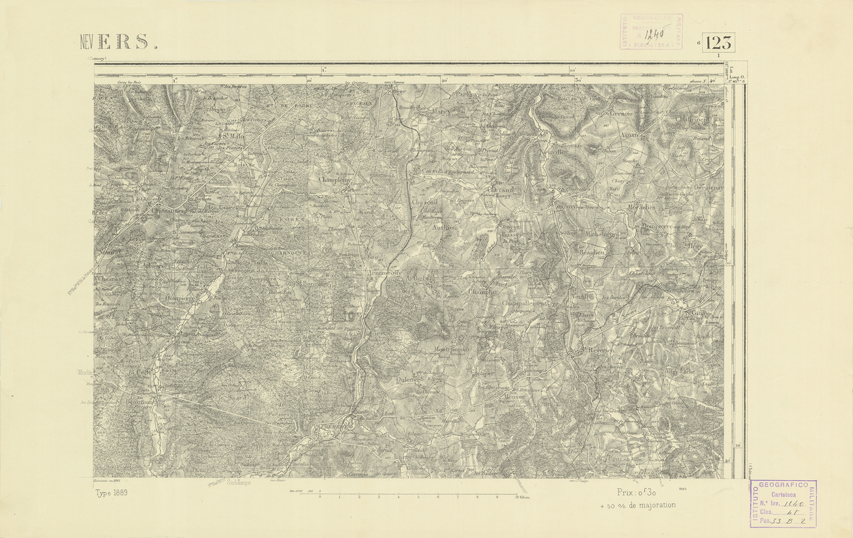 "Paris. Service Géographique de l'Armée, 1889. Ebbe origine dall'Edizione zincografica in quarti di foglio, stabilita dal 1879, per la carta detta de "L'Etat-Major". Infatti non rispondono più il sistema della riproduzione zincografica alle esigenze che la revisione dei fogli imponeva, per un inevitabile logoramento dei rami originali, fu proposta dapprima la correzione degli zinchi, ma questo, importando un lavoro lungo e gravoso, si adottò il procedimento galvanico. I rami galvanici ottenuti e corretti secondo questo sistema presero il nome di "édition type 1889". Allo scopo di facilitare l'incisione fu adoperata la suddivisione in quarti di foglio come per l'edizione zincografica. La revisione dei fogli di questo tipo non fu iniziata che nel 1893. Dal catalogo del S.G.A. risultano mancanti a questa edizione i dipartimenti della "Moselle", del "Bas-Rhin" e del "Haut-Rhin" per i quali non esiste che una edizione in fogli interi aggiornata nel 1901."