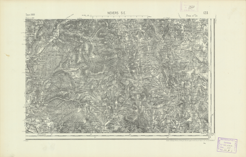 "Paris. Service Géographique de l'Armée, 1889. Ebbe origine dall'Edizione zincografica in quarti di foglio, stabilita dal 1879, per la carta detta de "L'Etat-Major". Infatti non rispondono più il sistema della riproduzione zincografica alle esigenze che la revisione dei fogli imponeva, per un inevitabile logoramento dei rami originali, fu proposta dapprima la correzione degli zinchi, ma questo, importando un lavoro lungo e gravoso, si adottò il procedimento galvanico. I rami galvanici ottenuti e corretti secondo questo sistema presero il nome di "édition type 1889". Allo scopo di facilitare l'incisione fu adoperata la suddivisione in quarti di foglio come per l'edizione zincografica. La revisione dei fogli di questo tipo non fu iniziata che nel 1893. Dal catalogo del S.G.A. risultano mancanti a questa edizione i dipartimenti della "Moselle", del "Bas-Rhin" e del "Haut-Rhin" per i quali non esiste che una edizione in fogli interi aggiornata nel 1901."