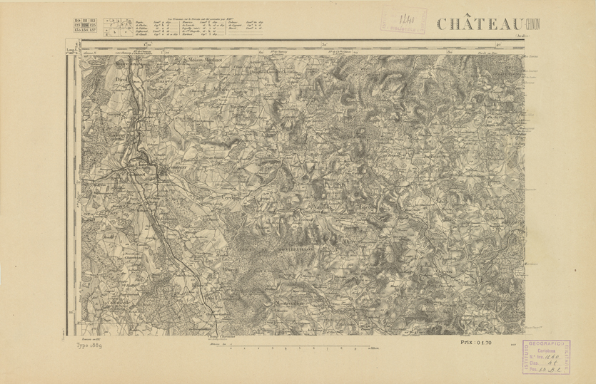 "Paris. Service Géographique de l'Armée, 1889. Ebbe origine dall'Edizione zincografica in quarti di foglio, stabilita dal 1879, per la carta detta de "L'Etat-Major". Infatti non rispondono più il sistema della riproduzione zincografica alle esigenze che la revisione dei fogli imponeva, per un inevitabile logoramento dei rami originali, fu proposta dapprima la correzione degli zinchi, ma questo, importando un lavoro lungo e gravoso, si adottò il procedimento galvanico. I rami galvanici ottenuti e corretti secondo questo sistema presero il nome di "édition type 1889". Allo scopo di facilitare l'incisione fu adoperata la suddivisione in quarti di foglio come per l'edizione zincografica. La revisione dei fogli di questo tipo non fu iniziata che nel 1893. Dal catalogo del S.G.A. risultano mancanti a questa edizione i dipartimenti della "Moselle", del "Bas-Rhin" e del "Haut-Rhin" per i quali non esiste che una edizione in fogli interi aggiornata nel 1901."