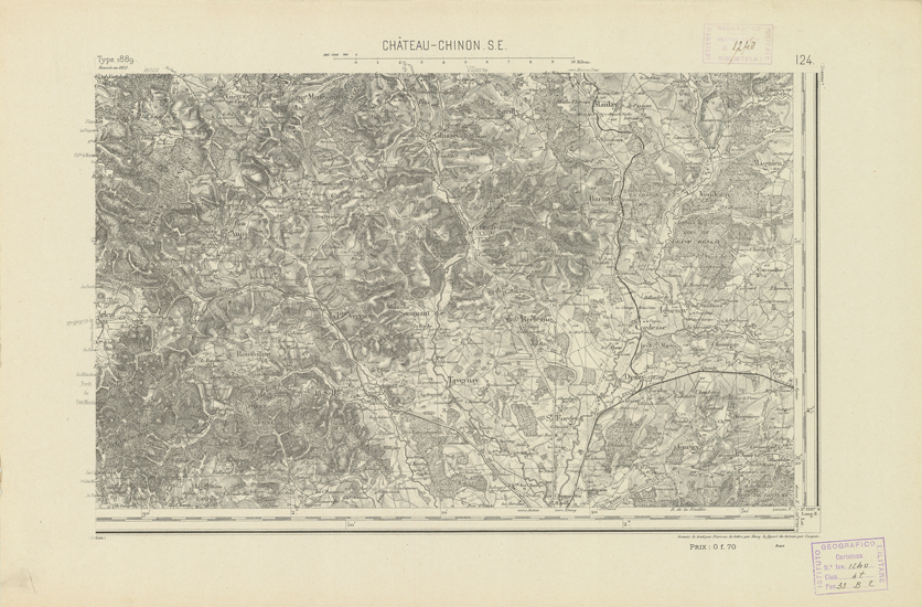 "Paris. Service Géographique de l'Armée, 1889. Ebbe origine dall'Edizione zincografica in quarti di foglio, stabilita dal 1879, per la carta detta de "L'Etat-Major". Infatti non rispondono più il sistema della riproduzione zincografica alle esigenze che la revisione dei fogli imponeva, per un inevitabile logoramento dei rami originali, fu proposta dapprima la correzione degli zinchi, ma questo, importando un lavoro lungo e gravoso, si adottò il procedimento galvanico. I rami galvanici ottenuti e corretti secondo questo sistema presero il nome di "édition type 1889". Allo scopo di facilitare l'incisione fu adoperata la suddivisione in quarti di foglio come per l'edizione zincografica. La revisione dei fogli di questo tipo non fu iniziata che nel 1893. Dal catalogo del S.G.A. risultano mancanti a questa edizione i dipartimenti della "Moselle", del "Bas-Rhin" e del "Haut-Rhin" per i quali non esiste che una edizione in fogli interi aggiornata nel 1901."