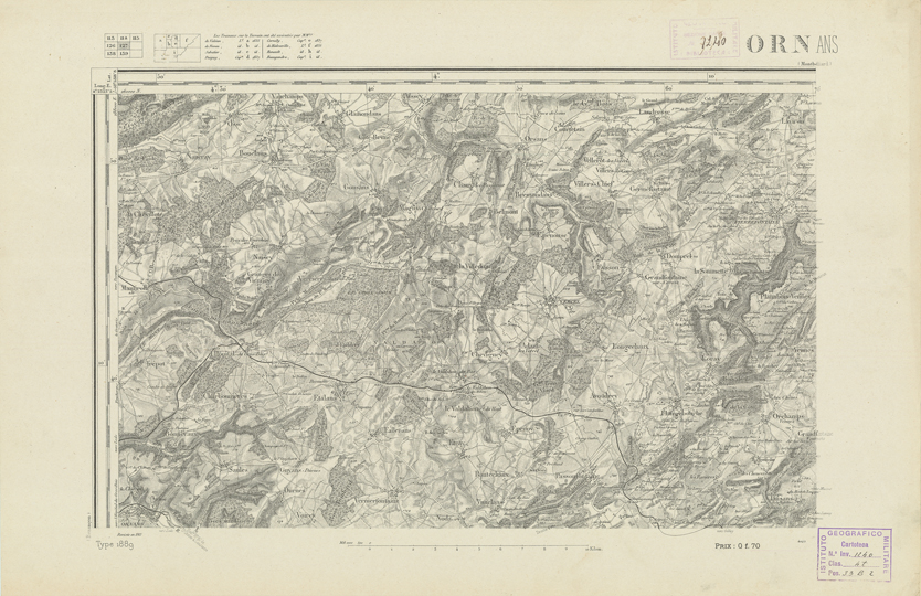 "Paris. Service Géographique de l'Armée, 1889. Ebbe origine dall'Edizione zincografica in quarti di foglio, stabilita dal 1879, per la carta detta de "L'Etat-Major". Infatti non rispondono più il sistema della riproduzione zincografica alle esigenze che la revisione dei fogli imponeva, per un inevitabile logoramento dei rami originali, fu proposta dapprima la correzione degli zinchi, ma questo, importando un lavoro lungo e gravoso, si adottò il procedimento galvanico. I rami galvanici ottenuti e corretti secondo questo sistema presero il nome di "édition type 1889". Allo scopo di facilitare l'incisione fu adoperata la suddivisione in quarti di foglio come per l'edizione zincografica. La revisione dei fogli di questo tipo non fu iniziata che nel 1893. Dal catalogo del S.G.A. risultano mancanti a questa edizione i dipartimenti della "Moselle", del "Bas-Rhin" e del "Haut-Rhin" per i quali non esiste che una edizione in fogli interi aggiornata nel 1901."