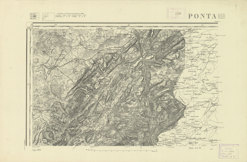 "Paris. Service Géographique de l'Armée, 1889. Ebbe origine dall'Edizione zincografica in quarti di foglio, stabilita dal 1879, per la carta detta de "L'Etat-Major". Infatti non rispondono più il sistema della riproduzione zincografica alle esigenze che la revisione dei fogli imponeva, per un inevitabile logoramento dei rami originali, fu proposta dapprima la correzione degli zinchi, ma questo, importando un lavoro lungo e gravoso, si adottò il procedimento galvanico. I rami galvanici ottenuti e corretti secondo questo sistema presero il nome di "édition type 1889". Allo scopo di facilitare l'incisione fu adoperata la suddivisione in quarti di foglio come per l'edizione zincografica. La revisione dei fogli di questo tipo non fu iniziata che nel 1893. Dal catalogo del S.G.A. risultano mancanti a questa edizione i dipartimenti della "Moselle", del "Bas-Rhin" e del "Haut-Rhin" per i quali non esiste che una edizione in fogli interi aggiornata nel 1901."