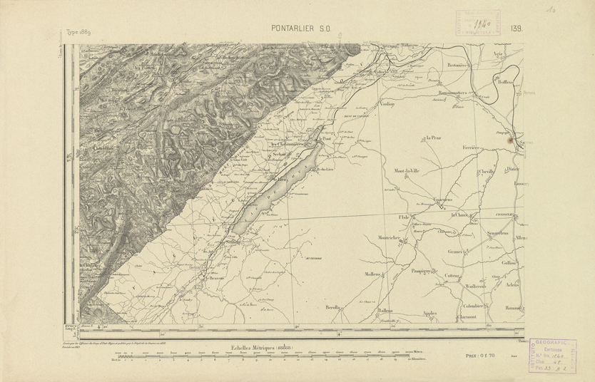 "Paris. Service Géographique de l'Armée, 1889. Ebbe origine dall'Edizione zincografica in quarti di foglio, stabilita dal 1879, per la carta detta de "L'Etat-Major". Infatti non rispondono più il sistema della riproduzione zincografica alle esigenze che la revisione dei fogli imponeva, per un inevitabile logoramento dei rami originali, fu proposta dapprima la correzione degli zinchi, ma questo, importando un lavoro lungo e gravoso, si adottò il procedimento galvanico. I rami galvanici ottenuti e corretti secondo questo sistema presero il nome di "édition type 1889". Allo scopo di facilitare l'incisione fu adoperata la suddivisione in quarti di foglio come per l'edizione zincografica. La revisione dei fogli di questo tipo non fu iniziata che nel 1893. Dal catalogo del S.G.A. risultano mancanti a questa edizione i dipartimenti della "Moselle", del "Bas-Rhin" e del "Haut-Rhin" per i quali non esiste che una edizione in fogli interi aggiornata nel 1901."