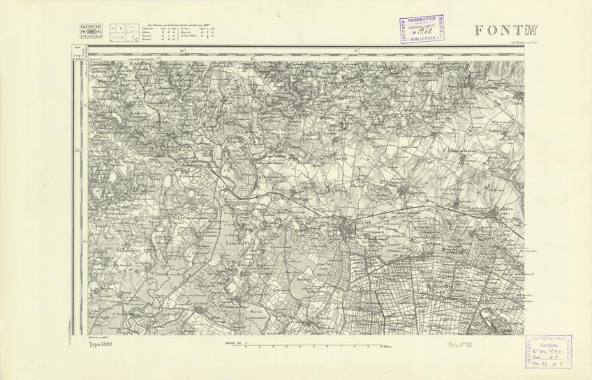 "Paris. Service Géographique de l'Armée, 1889. Ebbe origine dall'Edizione zincografica in quarti di foglio, stabilita dal 1879, per la carta detta de "L'Etat-Major". Infatti non rispondono più il sistema della riproduzione zincografica alle esigenze che la revisione dei fogli imponeva, per un inevitabile logoramento dei rami originali, fu proposta dapprima la correzione degli zinchi, ma questo, importando un lavoro lungo e gravoso, si adottò il procedimento galvanico. I rami galvanici ottenuti e corretti secondo questo sistema presero il nome di "édition type 1889". Allo scopo di facilitare l'incisione fu adoperata la suddivisione in quarti di foglio come per l'edizione zincografica. La revisione dei fogli di questo tipo non fu iniziata che nel 1893. Dal catalogo del S.G.A. risultano mancanti a questa edizione i dipartimenti della "Moselle", del "Bas-Rhin" e del "Haut-Rhin" per i quali non esiste che una edizione in fogli interi aggiornata nel 1901."