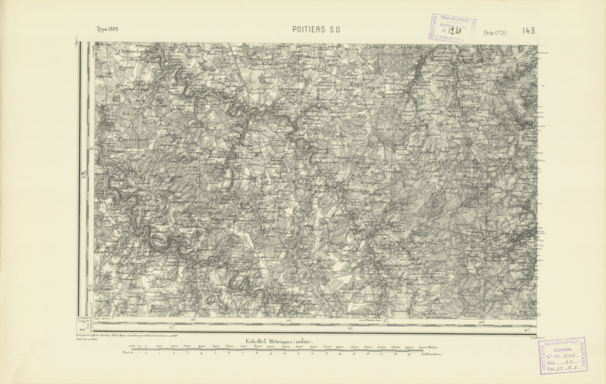 "Paris. Service Géographique de l'Armée, 1889. Ebbe origine dall'Edizione zincografica in quarti di foglio, stabilita dal 1879, per la carta detta de "L'Etat-Major". Infatti non rispondono più il sistema della riproduzione zincografica alle esigenze che la revisione dei fogli imponeva, per un inevitabile logoramento dei rami originali, fu proposta dapprima la correzione degli zinchi, ma questo, importando un lavoro lungo e gravoso, si adottò il procedimento galvanico. I rami galvanici ottenuti e corretti secondo questo sistema presero il nome di "édition type 1889". Allo scopo di facilitare l'incisione fu adoperata la suddivisione in quarti di foglio come per l'edizione zincografica. La revisione dei fogli di questo tipo non fu iniziata che nel 1893. Dal catalogo del S.G.A. risultano mancanti a questa edizione i dipartimenti della "Moselle", del "Bas-Rhin" e del "Haut-Rhin" per i quali non esiste che una edizione in fogli interi aggiornata nel 1901."