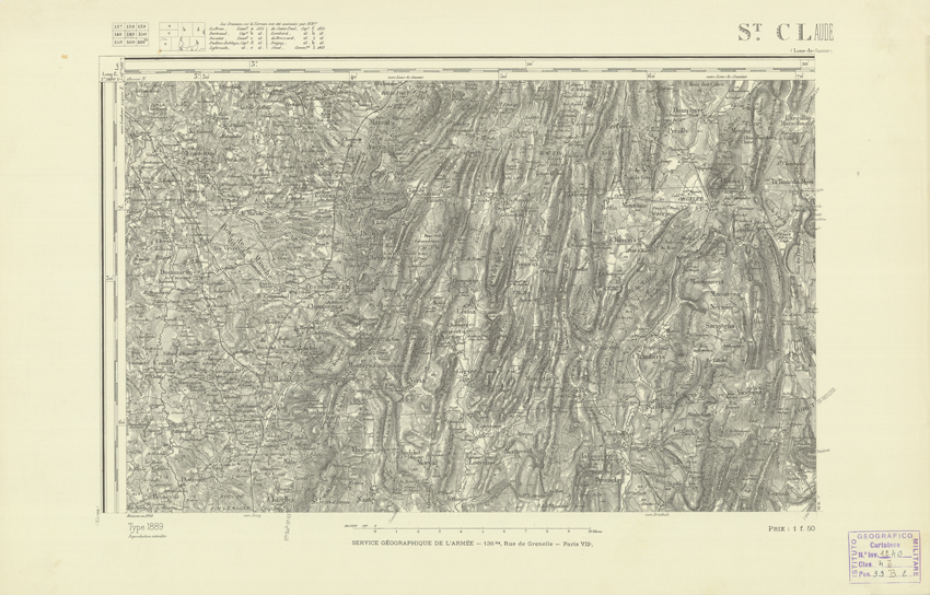 "Paris. Service Géographique de l'Armée, 1889. Ebbe origine dall'Edizione zincografica in quarti di foglio, stabilita dal 1879, per la carta detta de "L'Etat-Major". Infatti non rispondono più il sistema della riproduzione zincografica alle esigenze che la revisione dei fogli imponeva, per un inevitabile logoramento dei rami originali, fu proposta dapprima la correzione degli zinchi, ma questo, importando un lavoro lungo e gravoso, si adottò il procedimento galvanico. I rami galvanici ottenuti e corretti secondo questo sistema presero il nome di "édition type 1889". Allo scopo di facilitare l'incisione fu adoperata la suddivisione in quarti di foglio come per l'edizione zincografica. La revisione dei fogli di questo tipo non fu iniziata che nel 1893. Dal catalogo del S.G.A. risultano mancanti a questa edizione i dipartimenti della "Moselle", del "Bas-Rhin" e del "Haut-Rhin" per i quali non esiste che una edizione in fogli interi aggiornata nel 1901."