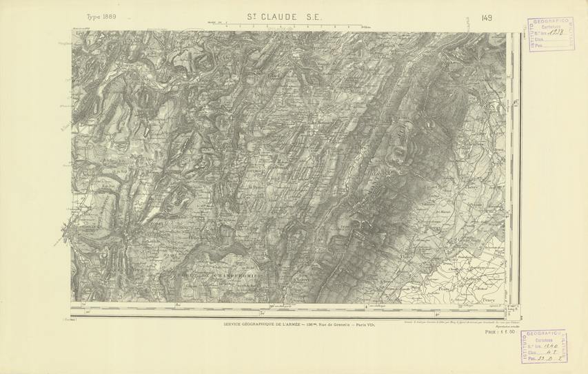 "Paris. Service Géographique de l'Armée, 1889. Ebbe origine dall'Edizione zincografica in quarti di foglio, stabilita dal 1879, per la carta detta de "L'Etat-Major". Infatti non rispondono più il sistema della riproduzione zincografica alle esigenze che la revisione dei fogli imponeva, per un inevitabile logoramento dei rami originali, fu proposta dapprima la correzione degli zinchi, ma questo, importando un lavoro lungo e gravoso, si adottò il procedimento galvanico. I rami galvanici ottenuti e corretti secondo questo sistema presero il nome di "édition type 1889". Allo scopo di facilitare l'incisione fu adoperata la suddivisione in quarti di foglio come per l'edizione zincografica. La revisione dei fogli di questo tipo non fu iniziata che nel 1893. Dal catalogo del S.G.A. risultano mancanti a questa edizione i dipartimenti della "Moselle", del "Bas-Rhin" e del "Haut-Rhin" per i quali non esiste che una edizione in fogli interi aggiornata nel 1901."