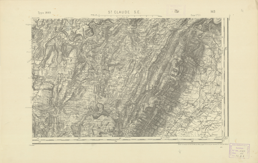 "Paris. Service Géographique de l'Armée, 1889. Ebbe origine dall'Edizione zincografica in quarti di foglio, stabilita dal 1879, per la carta detta de "L'Etat-Major". Infatti non rispondono più il sistema della riproduzione zincografica alle esigenze che la revisione dei fogli imponeva, per un inevitabile logoramento dei rami originali, fu proposta dapprima la correzione degli zinchi, ma questo, importando un lavoro lungo e gravoso, si adottò il procedimento galvanico. I rami galvanici ottenuti e corretti secondo questo sistema presero il nome di "édition type 1889". Allo scopo di facilitare l'incisione fu adoperata la suddivisione in quarti di foglio come per l'edizione zincografica. La revisione dei fogli di questo tipo non fu iniziata che nel 1893. Dal catalogo del S.G.A. risultano mancanti a questa edizione i dipartimenti della "Moselle", del "Bas-Rhin" e del "Haut-Rhin" per i quali non esiste che una edizione in fogli interi aggiornata nel 1901."