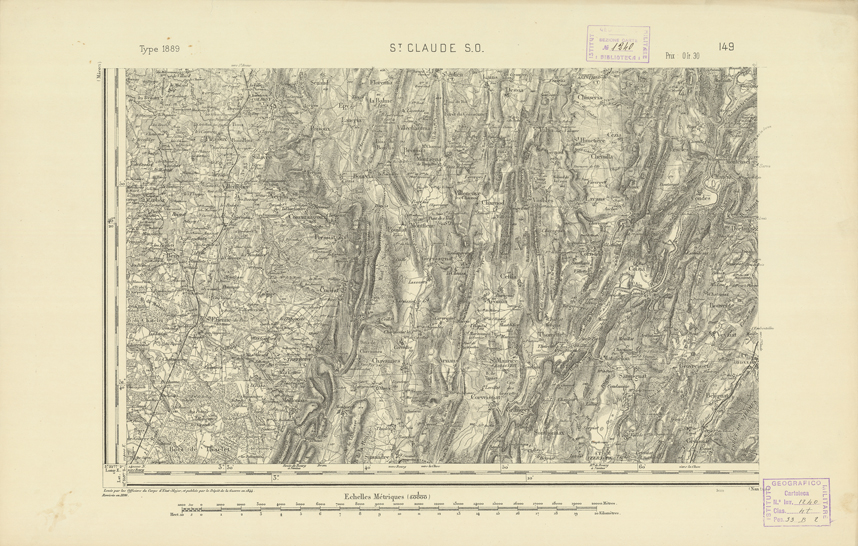 "Paris. Service Géographique de l'Armée, 1889. Ebbe origine dall'Edizione zincografica in quarti di foglio, stabilita dal 1879, per la carta detta de "L'Etat-Major". Infatti non rispondono più il sistema della riproduzione zincografica alle esigenze che la revisione dei fogli imponeva, per un inevitabile logoramento dei rami originali, fu proposta dapprima la correzione degli zinchi, ma questo, importando un lavoro lungo e gravoso, si adottò il procedimento galvanico. I rami galvanici ottenuti e corretti secondo questo sistema presero il nome di "édition type 1889". Allo scopo di facilitare l'incisione fu adoperata la suddivisione in quarti di foglio come per l'edizione zincografica. La revisione dei fogli di questo tipo non fu iniziata che nel 1893. Dal catalogo del S.G.A. risultano mancanti a questa edizione i dipartimenti della "Moselle", del "Bas-Rhin" e del "Haut-Rhin" per i quali non esiste che una edizione in fogli interi aggiornata nel 1901."