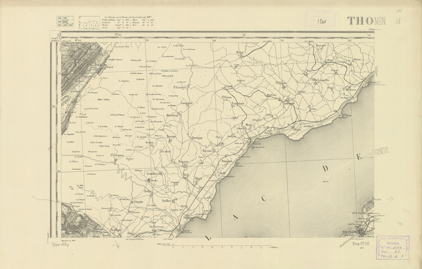 "Paris. Service Géographique de l'Armée, 1889. Ebbe origine dall'Edizione zincografica in quarti di foglio, stabilita dal 1879, per la carta detta de "L'Etat-Major". Infatti non rispondono più il sistema della riproduzione zincografica alle esigenze che la revisione dei fogli imponeva, per un inevitabile logoramento dei rami originali, fu proposta dapprima la correzione degli zinchi, ma questo, importando un lavoro lungo e gravoso, si adottò il procedimento galvanico. I rami galvanici ottenuti e corretti secondo questo sistema presero il nome di "édition type 1889". Allo scopo di facilitare l'incisione fu adoperata la suddivisione in quarti di foglio come per l'edizione zincografica. La revisione dei fogli di questo tipo non fu iniziata che nel 1893. Dal catalogo del S.G.A. risultano mancanti a questa edizione i dipartimenti della "Moselle", del "Bas-Rhin" e del "Haut-Rhin" per i quali non esiste che una edizione in fogli interi aggiornata nel 1901."