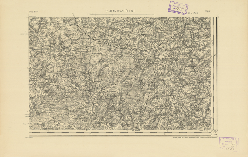 "Paris. Service Géographique de l'Armée, 1889. Ebbe origine dall'Edizione zincografica in quarti di foglio, stabilita dal 1879, per la carta detta de "L'Etat-Major". Infatti non rispondono più il sistema della riproduzione zincografica alle esigenze che la revisione dei fogli imponeva, per un inevitabile logoramento dei rami originali, fu proposta dapprima la correzione degli zinchi, ma questo, importando un lavoro lungo e gravoso, si adottò il procedimento galvanico. I rami galvanici ottenuti e corretti secondo questo sistema presero il nome di "édition type 1889". Allo scopo di facilitare l'incisione fu adoperata la suddivisione in quarti di foglio come per l'edizione zincografica. La revisione dei fogli di questo tipo non fu iniziata che nel 1893. Dal catalogo del S.G.A. risultano mancanti a questa edizione i dipartimenti della "Moselle", del "Bas-Rhin" e del "Haut-Rhin" per i quali non esiste che una edizione in fogli interi aggiornata nel 1901."