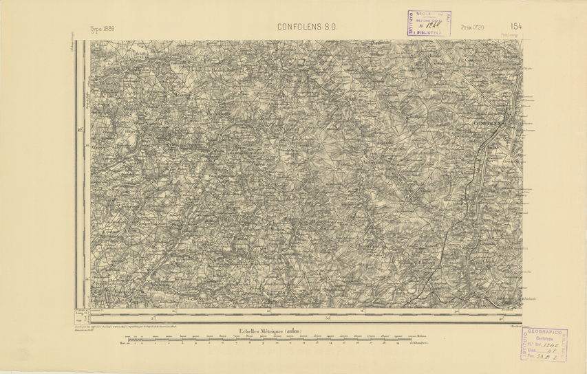 "Paris. Service Géographique de l'Armée, 1889. Ebbe origine dall'Edizione zincografica in quarti di foglio, stabilita dal 1879, per la carta detta de "L'Etat-Major". Infatti non rispondono più il sistema della riproduzione zincografica alle esigenze che la revisione dei fogli imponeva, per un inevitabile logoramento dei rami originali, fu proposta dapprima la correzione degli zinchi, ma questo, importando un lavoro lungo e gravoso, si adottò il procedimento galvanico. I rami galvanici ottenuti e corretti secondo questo sistema presero il nome di "édition type 1889". Allo scopo di facilitare l'incisione fu adoperata la suddivisione in quarti di foglio come per l'edizione zincografica. La revisione dei fogli di questo tipo non fu iniziata che nel 1893. Dal catalogo del S.G.A. risultano mancanti a questa edizione i dipartimenti della "Moselle", del "Bas-Rhin" e del "Haut-Rhin" per i quali non esiste che una edizione in fogli interi aggiornata nel 1901."