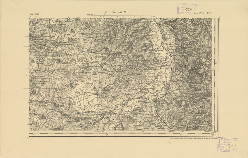 "Paris. Service Géographique de l'Armée, 1889. Ebbe origine dall'Edizione zincografica in quarti di foglio, stabilita dal 1879, per la carta detta de "L'Etat-Major". Infatti non rispondono più il sistema della riproduzione zincografica alle esigenze che la revisione dei fogli imponeva, per un inevitabile logoramento dei rami originali, fu proposta dapprima la correzione degli zinchi, ma questo, importando un lavoro lungo e gravoso, si adottò il procedimento galvanico. I rami galvanici ottenuti e corretti secondo questo sistema presero il nome di "édition type 1889". Allo scopo di facilitare l'incisione fu adoperata la suddivisione in quarti di foglio come per l'edizione zincografica. La revisione dei fogli di questo tipo non fu iniziata che nel 1893. Dal catalogo del S.G.A. risultano mancanti a questa edizione i dipartimenti della "Moselle", del "Bas-Rhin" e del "Haut-Rhin" per i quali non esiste che una edizione in fogli interi aggiornata nel 1901."