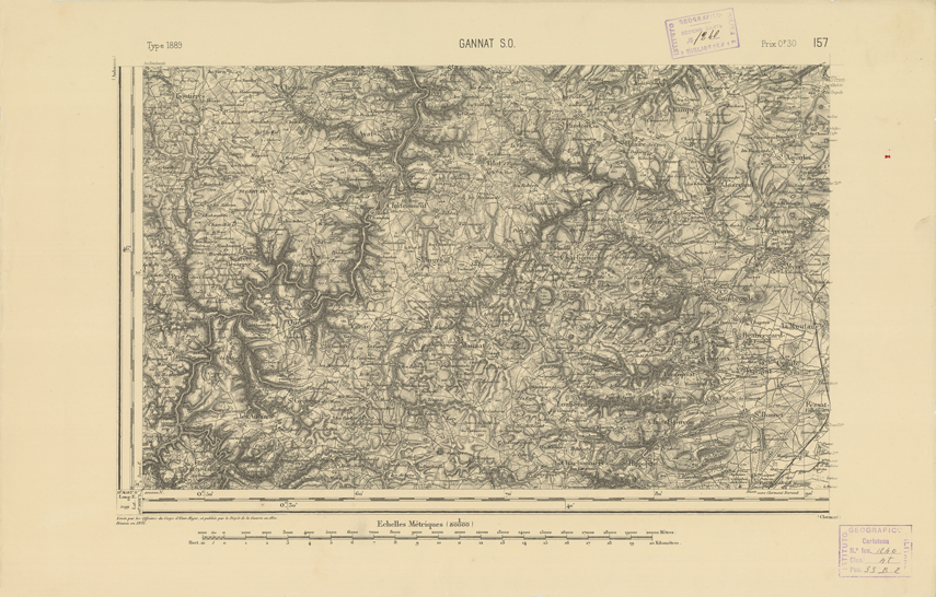 "Paris. Service Géographique de l'Armée, 1889. Ebbe origine dall'Edizione zincografica in quarti di foglio, stabilita dal 1879, per la carta detta de "L'Etat-Major". Infatti non rispondono più il sistema della riproduzione zincografica alle esigenze che la revisione dei fogli imponeva, per un inevitabile logoramento dei rami originali, fu proposta dapprima la correzione degli zinchi, ma questo, importando un lavoro lungo e gravoso, si adottò il procedimento galvanico. I rami galvanici ottenuti e corretti secondo questo sistema presero il nome di "édition type 1889". Allo scopo di facilitare l'incisione fu adoperata la suddivisione in quarti di foglio come per l'edizione zincografica. La revisione dei fogli di questo tipo non fu iniziata che nel 1893. Dal catalogo del S.G.A. risultano mancanti a questa edizione i dipartimenti della "Moselle", del "Bas-Rhin" e del "Haut-Rhin" per i quali non esiste che una edizione in fogli interi aggiornata nel 1901."