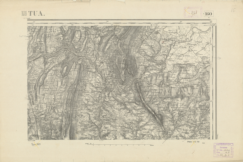 "Paris. Service Géographique de l'Armée, 1889. Ebbe origine dall'Edizione zincografica in quarti di foglio, stabilita dal 1879, per la carta detta de "L'Etat-Major". Infatti non rispondono più il sistema della riproduzione zincografica alle esigenze che la revisione dei fogli imponeva, per un inevitabile logoramento dei rami originali, fu proposta dapprima la correzione degli zinchi, ma questo, importando un lavoro lungo e gravoso, si adottò il procedimento galvanico. I rami galvanici ottenuti e corretti secondo questo sistema presero il nome di "édition type 1889". Allo scopo di facilitare l'incisione fu adoperata la suddivisione in quarti di foglio come per l'edizione zincografica. La revisione dei fogli di questo tipo non fu iniziata che nel 1893. Dal catalogo del S.G.A. risultano mancanti a questa edizione i dipartimenti della "Moselle", del "Bas-Rhin" e del "Haut-Rhin" per i quali non esiste che una edizione in fogli interi aggiornata nel 1901."