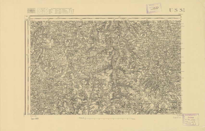 "Paris. Service Géographique de l'Armée, 1889. Ebbe origine dall'Edizione zincografica in quarti di foglio, stabilita dal 1879, per la carta detta de "L'Etat-Major". Infatti non rispondono più il sistema della riproduzione zincografica alle esigenze che la revisione dei fogli imponeva, per un inevitabile logoramento dei rami originali, fu proposta dapprima la correzione degli zinchi, ma questo, importando un lavoro lungo e gravoso, si adottò il procedimento galvanico. I rami galvanici ottenuti e corretti secondo questo sistema presero il nome di "édition type 1889". Allo scopo di facilitare l'incisione fu adoperata la suddivisione in quarti di foglio come per l'edizione zincografica. La revisione dei fogli di questo tipo non fu iniziata che nel 1893. Dal catalogo del S.G.A. risultano mancanti a questa edizione i dipartimenti della "Moselle", del "Bas-Rhin" e del "Haut-Rhin" per i quali non esiste che una edizione in fogli interi aggiornata nel 1901."
