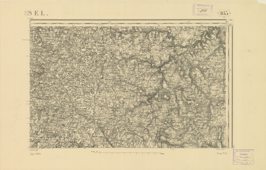 "Paris. Service Géographique de l'Armée, 1889. Ebbe origine dall'Edizione zincografica in quarti di foglio, stabilita dal 1879, per la carta detta de "L'Etat-Major". Infatti non rispondono più il sistema della riproduzione zincografica alle esigenze che la revisione dei fogli imponeva, per un inevitabile logoramento dei rami originali, fu proposta dapprima la correzione degli zinchi, ma questo, importando un lavoro lungo e gravoso, si adottò il procedimento galvanico. I rami galvanici ottenuti e corretti secondo questo sistema presero il nome di "édition type 1889". Allo scopo di facilitare l'incisione fu adoperata la suddivisione in quarti di foglio come per l'edizione zincografica. La revisione dei fogli di questo tipo non fu iniziata che nel 1893. Dal catalogo del S.G.A. risultano mancanti a questa edizione i dipartimenti della "Moselle", del "Bas-Rhin" e del "Haut-Rhin" per i quali non esiste che una edizione in fogli interi aggiornata nel 1901."