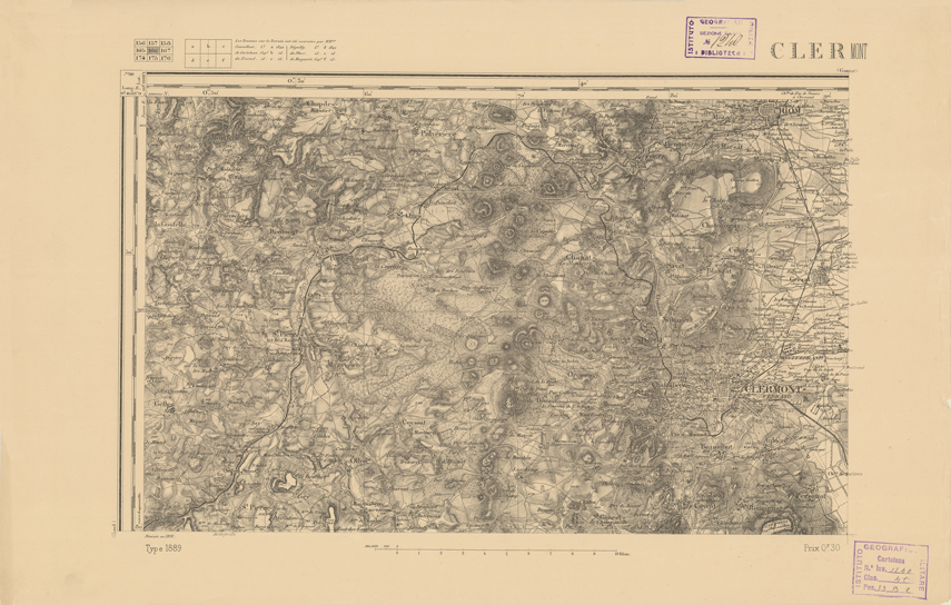 "Paris. Service Géographique de l'Armée, 1889. Ebbe origine dall'Edizione zincografica in quarti di foglio, stabilita dal 1879, per la carta detta de "L'Etat-Major". Infatti non rispondono più il sistema della riproduzione zincografica alle esigenze che la revisione dei fogli imponeva, per un inevitabile logoramento dei rami originali, fu proposta dapprima la correzione degli zinchi, ma questo, importando un lavoro lungo e gravoso, si adottò il procedimento galvanico. I rami galvanici ottenuti e corretti secondo questo sistema presero il nome di "édition type 1889". Allo scopo di facilitare l'incisione fu adoperata la suddivisione in quarti di foglio come per l'edizione zincografica. La revisione dei fogli di questo tipo non fu iniziata che nel 1893. Dal catalogo del S.G.A. risultano mancanti a questa edizione i dipartimenti della "Moselle", del "Bas-Rhin" e del "Haut-Rhin" per i quali non esiste che una edizione in fogli interi aggiornata nel 1901."