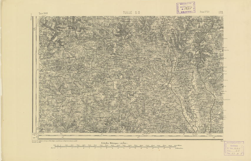"Paris. Service Géographique de l'Armée, 1889. Ebbe origine dall'Edizione zincografica in quarti di foglio, stabilita dal 1879, per la carta detta de "L'Etat-Major". Infatti non rispondono più il sistema della riproduzione zincografica alle esigenze che la revisione dei fogli imponeva, per un inevitabile logoramento dei rami originali, fu proposta dapprima la correzione degli zinchi, ma questo, importando un lavoro lungo e gravoso, si adottò il procedimento galvanico. I rami galvanici ottenuti e corretti secondo questo sistema presero il nome di "édition type 1889". Allo scopo di facilitare l'incisione fu adoperata la suddivisione in quarti di foglio come per l'edizione zincografica. La revisione dei fogli di questo tipo non fu iniziata che nel 1893. Dal catalogo del S.G.A. risultano mancanti a questa edizione i dipartimenti della "Moselle", del "Bas-Rhin" e del "Haut-Rhin" per i quali non esiste che una edizione in fogli interi aggiornata nel 1901."